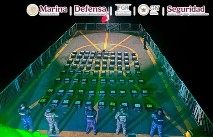 En una operación marítima encabezada por elementos de la Secretaría de Marina (Semar), a través de la Armada de México en funciones de Guardia Costera, en coordinación con la Fiscalía General de la República (FGR) y la Secretaría de Seguridad y Protección Ciudadana (SSPC), se aseguraron 80 bultos con aproximadamente dos toneladas de presunta cocaína, cuyo peso exacto será determinado por las autoridades ministeriales correspondientes.